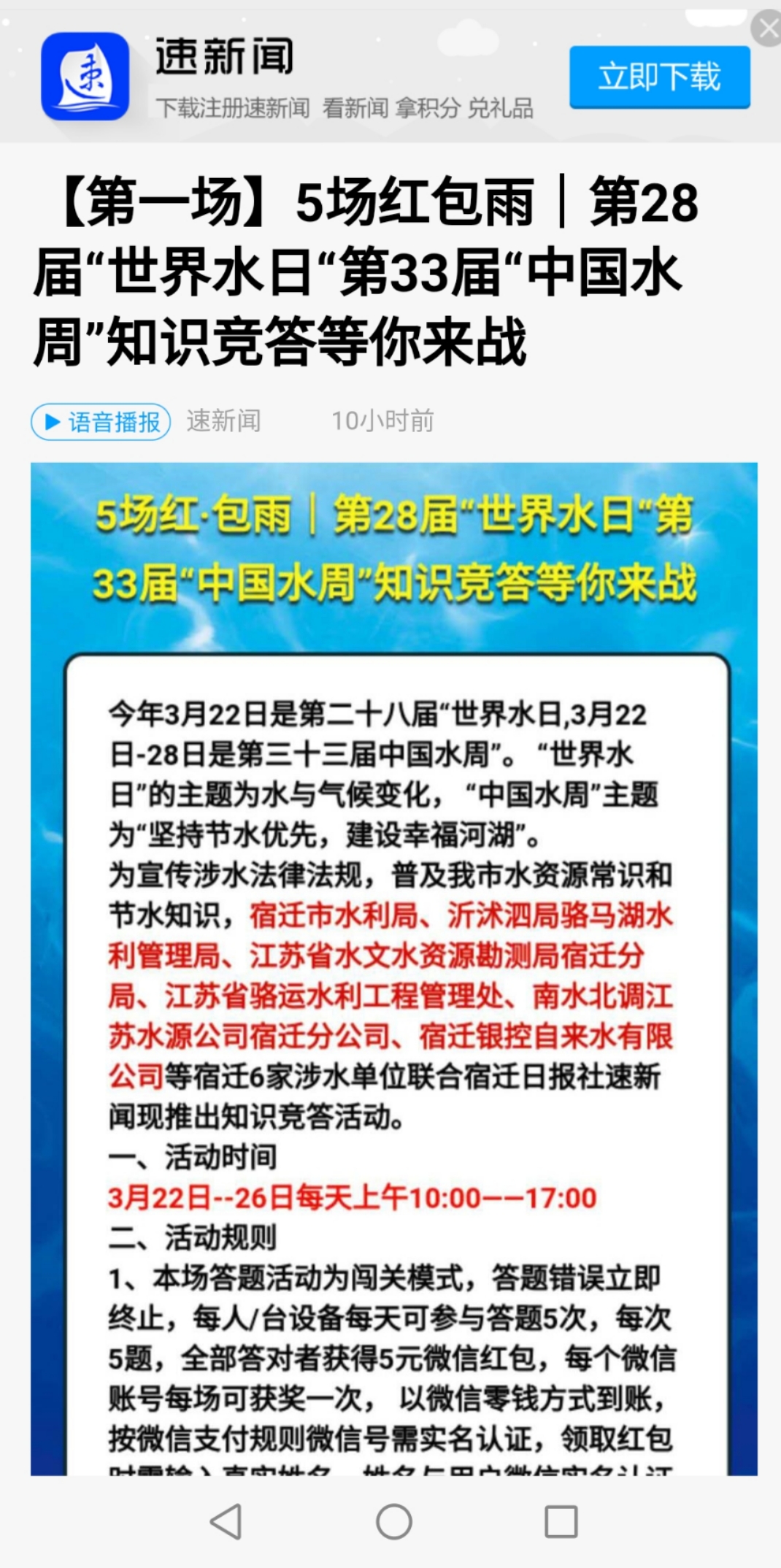 “汴水流,泗水流,流到瓜州古渡頭”。位于蘇北泗水畔的酒都宿遷以洋河美酒聞名大江南北乃至全世界。水是酒的命脈,好酒必有好水。宿遷,別稱“水城”,地處淮河、沂沭泗流域中下游,南臨洪澤湖,北接駱馬湖,著名的京杭大運(yùn)河穿境而過。在3月22日“世界水日“、3月22日—28日 “中國水周”到來之機(jī),聯(lián)合水務(wù)宿遷銀控自來水有限公司會同宿遷市水利局、沂沭泗局駱馬湖水利管理局、江蘇省水文水資源勘測局宿遷分局、南水北調(diào)江蘇水源公司宿遷分公司及宿遷日報社共同舉辦系列宣傳活動,護(hù)衛(wèi)城市命脈,傳承生態(tài)愿景。一方水土養(yǎng)一方人, 節(jié)水、護(hù)水、愛水,全員行動起來,讓水韻宿遷更加大放光彩。 受疫情影響,今年宿遷市的“世界水日”、“中國水周”宣傳活動采用線上方式扎實(shí)開展,方式新穎且力度不減。經(jīng)過前期合辦單位的用心籌劃,圍繞今年國家水利部確定的“堅持節(jié)水優(yōu)先 建設(shè)幸福河湖”的宣傳主題,系列宣傳活動以別開生面、匠心獨(dú)具的六大方式精彩呈現(xiàn),提高全市人民節(jié)水、護(hù)水、愛水意識,形成全員參與、共創(chuàng)水生態(tài)美好家園的良好氛圍。 全民總動員開始啦!網(wǎng)絡(luò)倡議書簽名轉(zhuǎn)發(fā)活動,倡議書內(nèi)容豐富,既有宿遷市水資源知識,還有節(jié)水小竅門呢,以百姓喜聞樂見的微信群、通過微信群、微信朋友圈方式進(jìn)行轉(zhuǎn)發(fā);網(wǎng)絡(luò)答題贏紅包活動,5場“紅包雨”,第28屆“世界水日”、第33屆“中國水周”知識全民競技,寓教于樂;意見建議征集活動,保護(hù)水資源,你獻(xiàn)計,他獻(xiàn)策,水更清、城更美,民更樂;網(wǎng)上攝影展活動,用鏡頭拍下最美水景,感受水鄉(xiāng)靈韻;水美文章征文活動,分享《童年的河》,一水一情,讓故鄉(xiāng)的水在心間流淌;彩印卡片+鮮花贈送活動,水法宣傳不見面,投放在銀行、商場、醫(yī)院、公園、公交站臺等公共場所,全民知法、懂法、守法,愛護(hù)水源,人人有責(zé)。宿遷銀控自來水有限公司動員公司全體員工積極參與各類活動,以實(shí)際行動支持節(jié)水、護(hù)水、愛水行動。 圖1:節(jié)水倡議書冠名單位